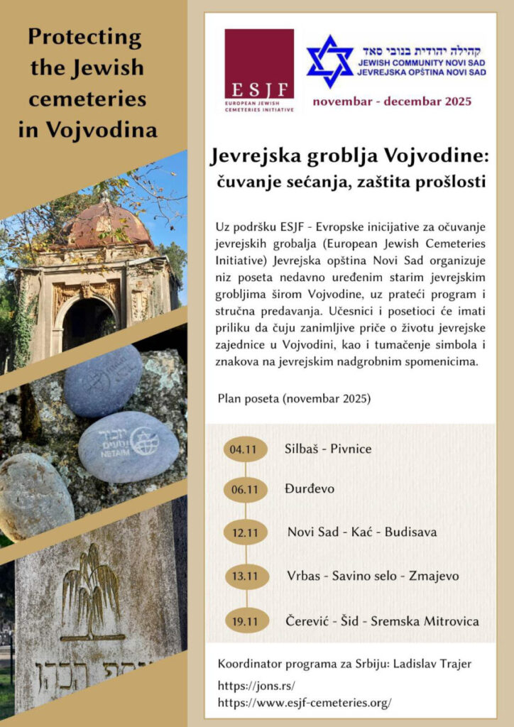 Uz podršku ESJF – Evropske inicijative za očuvanje jevrejskih grobalja (European Jewish Cemeteries Initiative) Jevrejska opština Novi Sad organizuje niz poseta nedavno uređenim starim jevrejskim grobljima širom Vojvodine, uz prateći program i stručna predavanja.