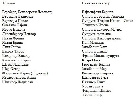 У Јеврејској заједници у Новом Саду деловали су и хорови. Тако се код Павла Шозбергера помиње певачко друштво Хаземер из 1923. године, као и певачко друштво Хашира (1934–1941). Првопоменуто певачко друштво основали су Александар Розенбаум, Емил Санто и Алекса Клајн. Имало је 36 чланова, а последњи концерт одржан је у октобру 1924. године. Изгледа да је ово друштво предстало с радом наредне 1925. године, у октобру.1 Значајније резултате у деловању постигао је хор Хашира који је по оснивању деловао седам година и престао с радом, без сумње, због почетка Другог светског рата. Основали су га Вертхајм, др Виктор Часар, Људевит Сматана и Кимелберг (Шосбергер, 2011:88). Са 64 активна члана овај ансамбл је одржао више „успешних концерата“ (Исто). После рата је Оскар Шер, један од чланова, окупио шест преживелих певача хора који су одржали концерт, а затим се сложили да престану с радом. Ово певачко друштво је, међутим, обновљено и данас бележи изванредне резултате на пољу концертантне активности. Павле Шосбергер у својој књизи помиње чланове хора Хашире и певаче синагогалног хора: