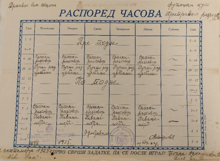 Историчарка Олга Андраши наводи да је „Јеврејска основна школа функционисала на овај начин све до 1920. године. Тада је у новој држави, Краљевини Срба, Хрвата и Словенаца, и у Војводини примењен Закон о школству Србије из 1904. године. Укинуте су националне и приватне школе, односно све школе су подржављене. Јеврејска основна школа постала је ‘Државна основна школа на Футошком путу’. Започело је ново раздобље у њеној историји које ће трајати до 1941. године”.1 У овој етнички и верски мешовитој школи постојао је предмет „Певање и игра“, који су слушали ученици припремног разреда, као и предмет „Певање и гимнастика“ за ученике првог разреда. Необично повезивање певања и гимнастике може се сматрати елементом континуитета „Државне основне школе на Футошком путу“ с Јеврејском школом, бар на нивоу третмана музичког образовања и васпитања.