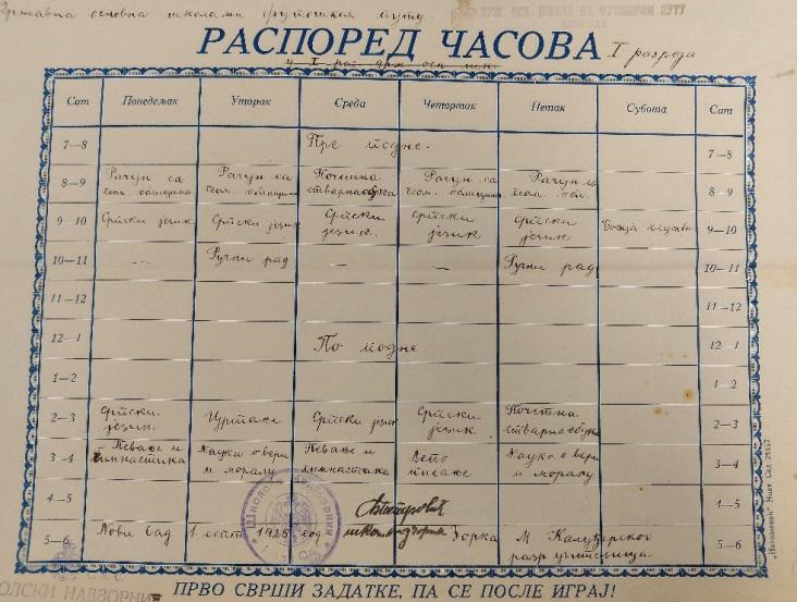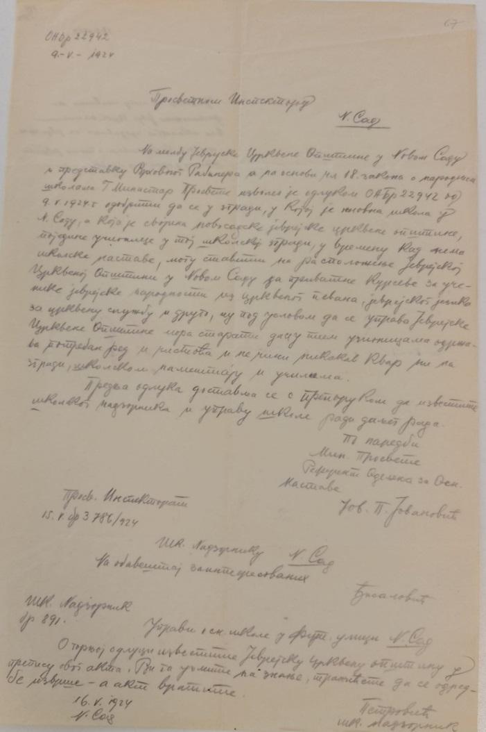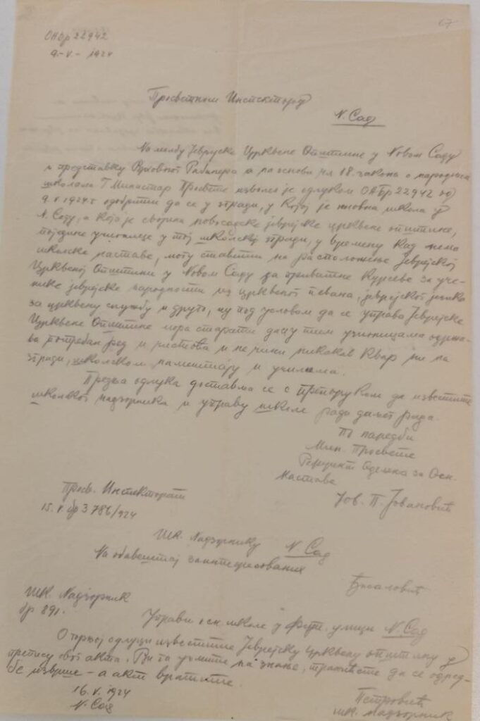 Архив града Новог Сада садржи и документ из кога се види да је просветни инспектор дозволио држање приватне наставе црквеног певања у овој школи.