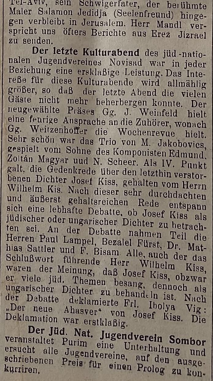 Последње Културно вече Јеврејског националног омладинског друштва Нови Сад било је у сваком смислу првокласно вођено. Интересовање за ове културне вечери постепено је расло, тако да последње није могло да угости толико гостију. Новоизабрани председник Ј. Вајнфелд одржао је ватрени говор слушаоцима, после чега је г. Вајценхофер одржао недељни преглед. Трио М. Јакобович, био је веома леп, а свирали су синови композитора Едмунда, Золтан Мађар и Н. Шир. Четврта тачка програма био је комеморативни говор о недавно преминулом песнику Јозефу Кишу који је одржао господин Вилхелм Киш. После ове веома продубљене и изузетне приче, развила се жива дебата да ли се Јозеф Киш сматра за јеврејског или мађарског песника. Следећа господа су дебатовала: Паул Лампел, Бецалел Фирст, др Матијас Затлер и Ф. Бизам. Сви, укључујући господина Вилхелма Киша са његовом закључном речи, били су мишљења да се Јозеф Киш, иако је обрађивао много јеврејских тема, ипак сматра мађарским песником. На крају је госпођица Ибоља Виг говорила песму под називом „Нови Ахасвер“ Јозефа Киша. Рецитовала је првокласно