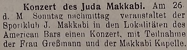 Концерт Јуда Makkabi. Двадесетшестог о. месеца, у недељу поподне спортски клуб Јуда Makabbi организује у Америчком бару конзерт на којем учествују госпођа Гросман и Kapella Makabbi. (овом вешћу сазнајемо да је спортски клуб имао и своју капелу, дакле оркестар).
