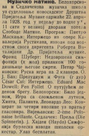 Најава концерта ученика из музичке школе Белохорског (Белогорског) и Седлачека, лист Застава, 22. 4. 1928,